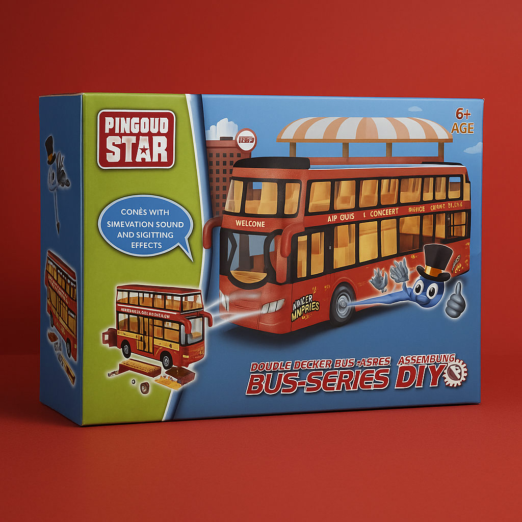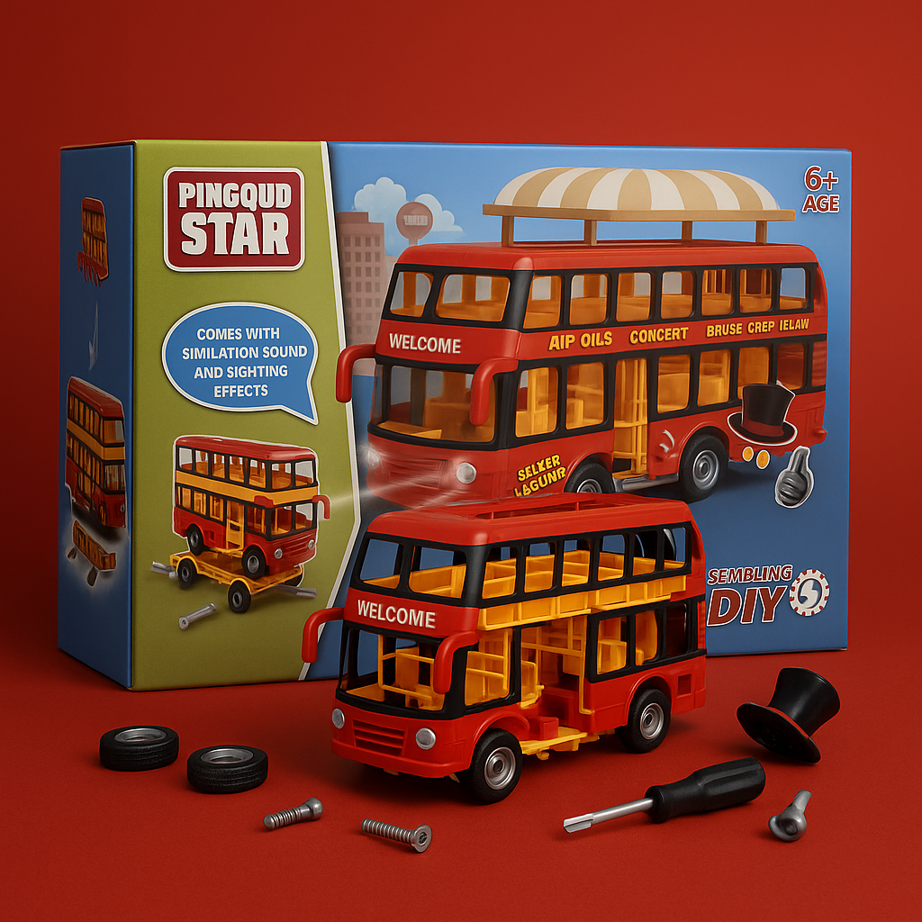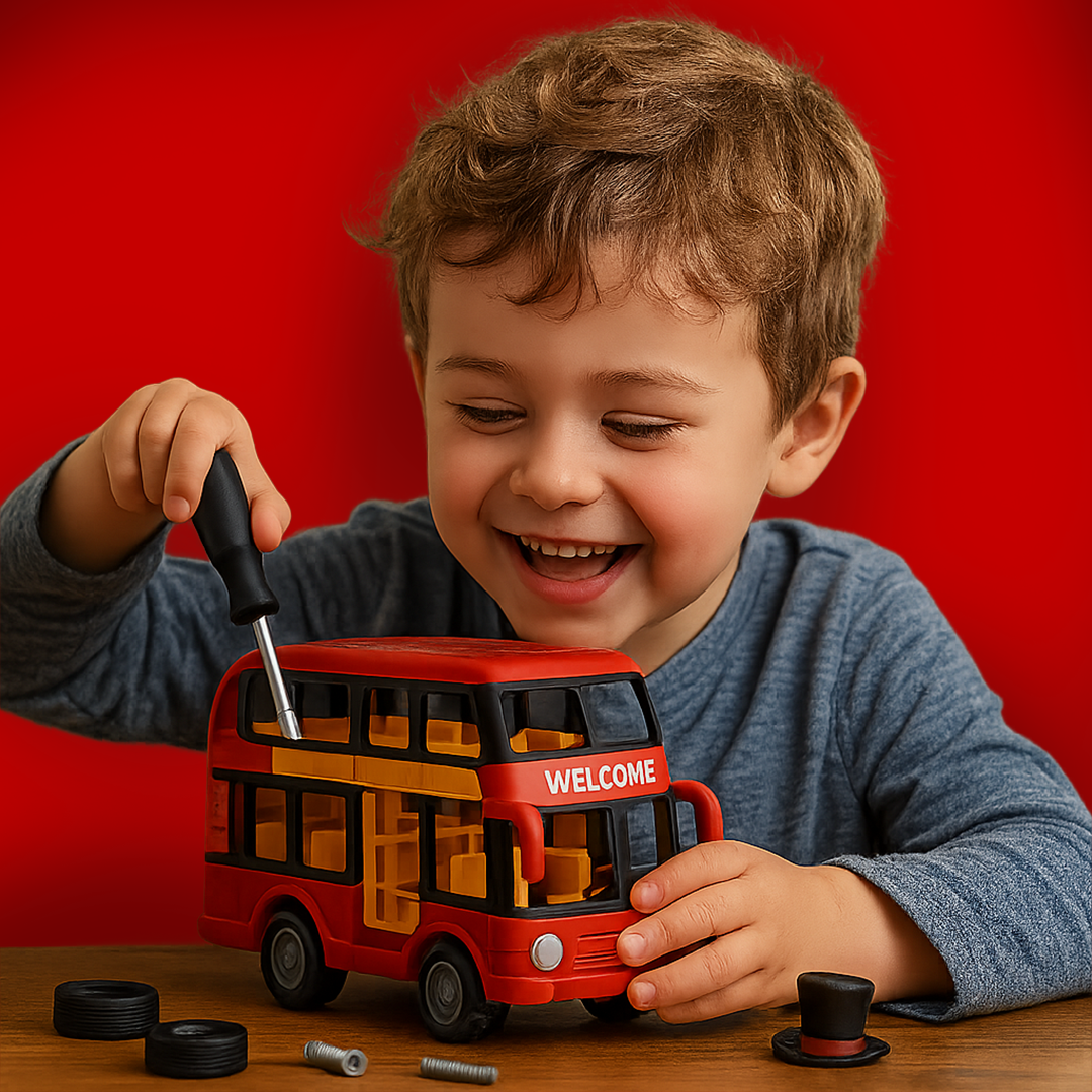 Со овој DIY Double Decker Автобус, твоето дете ќе може самостојно да состави вистински двокатен автобус – со светлосни и звучни ефекти за уште пореално искуство! 🚌✨